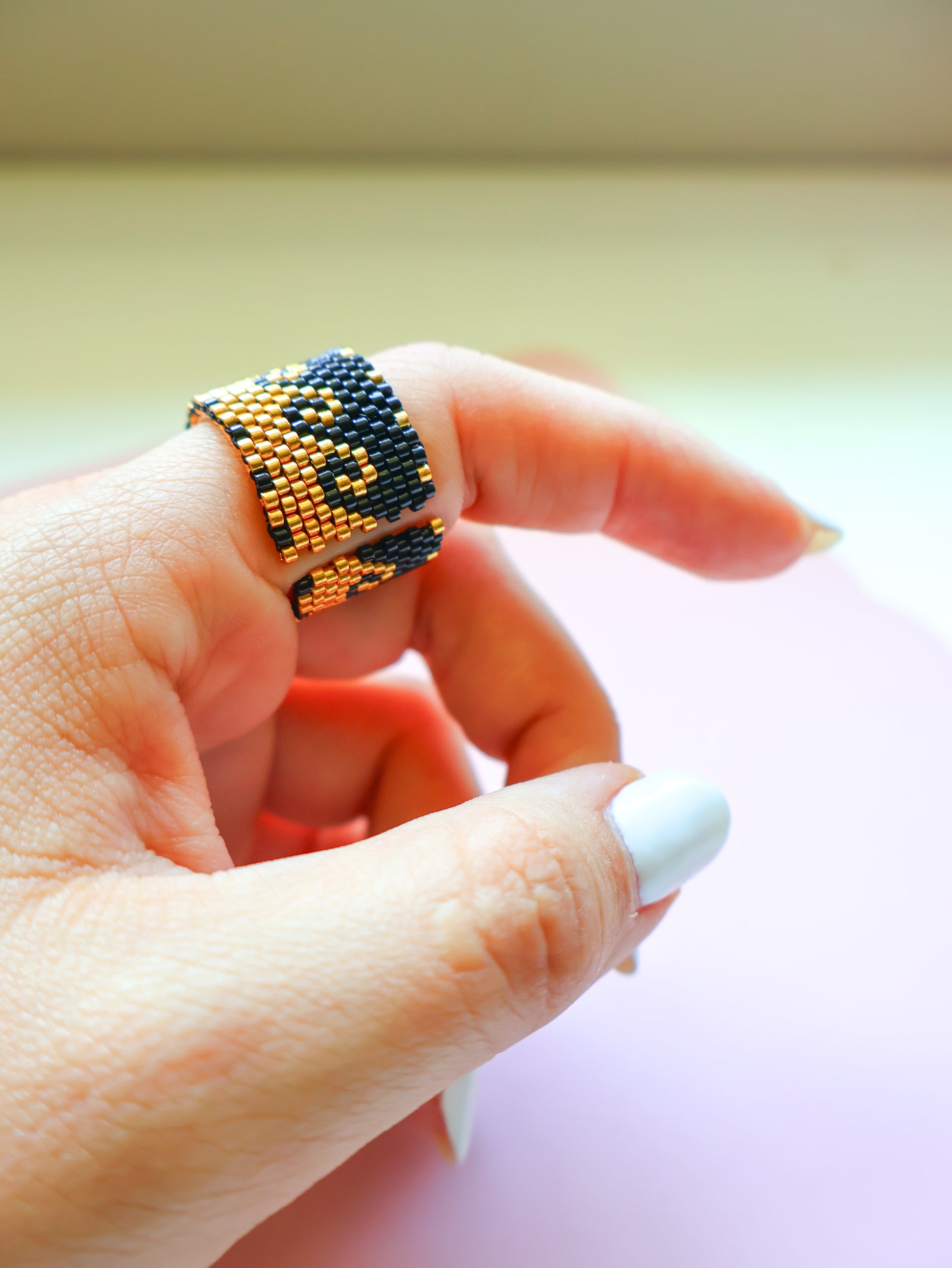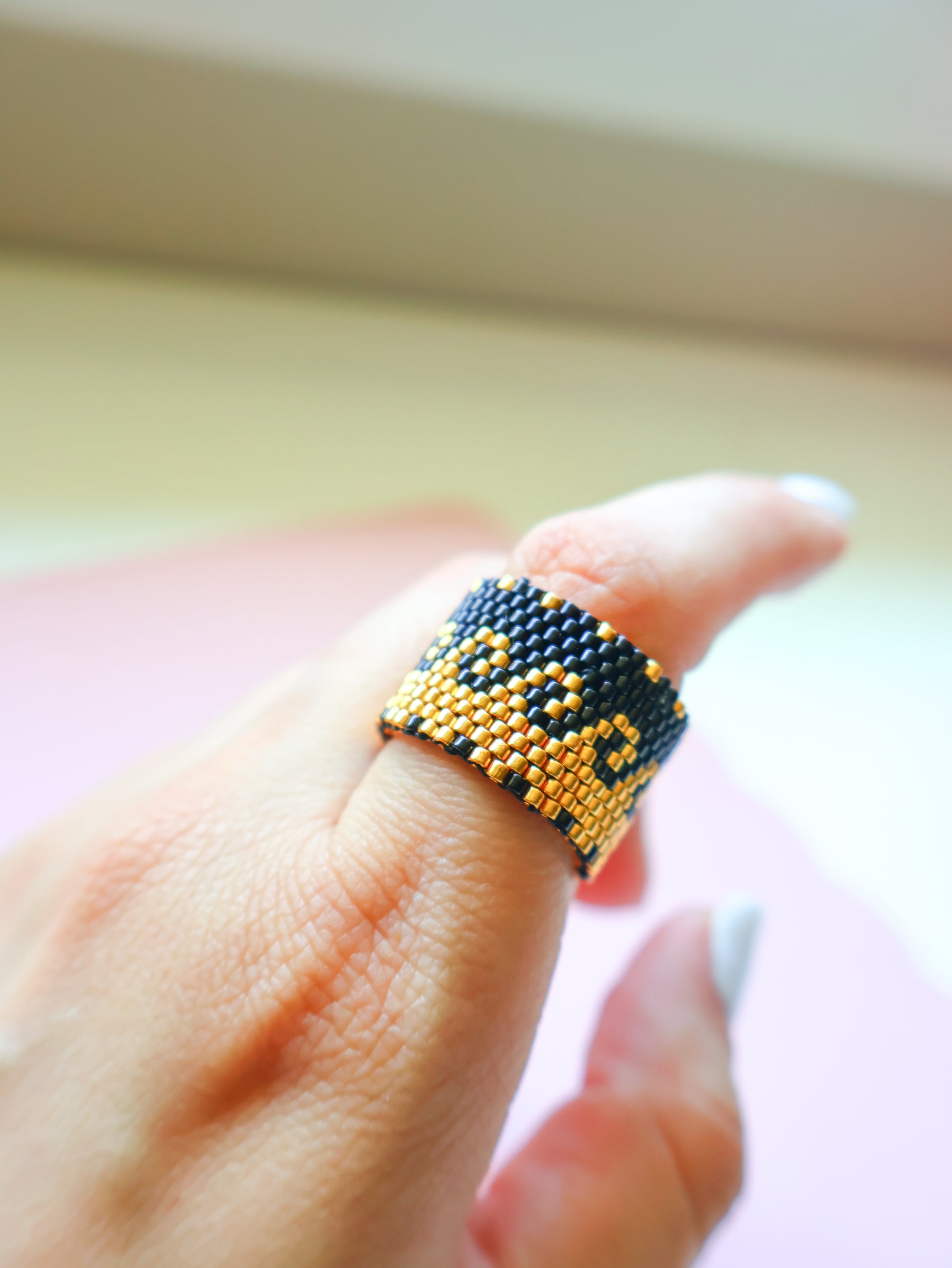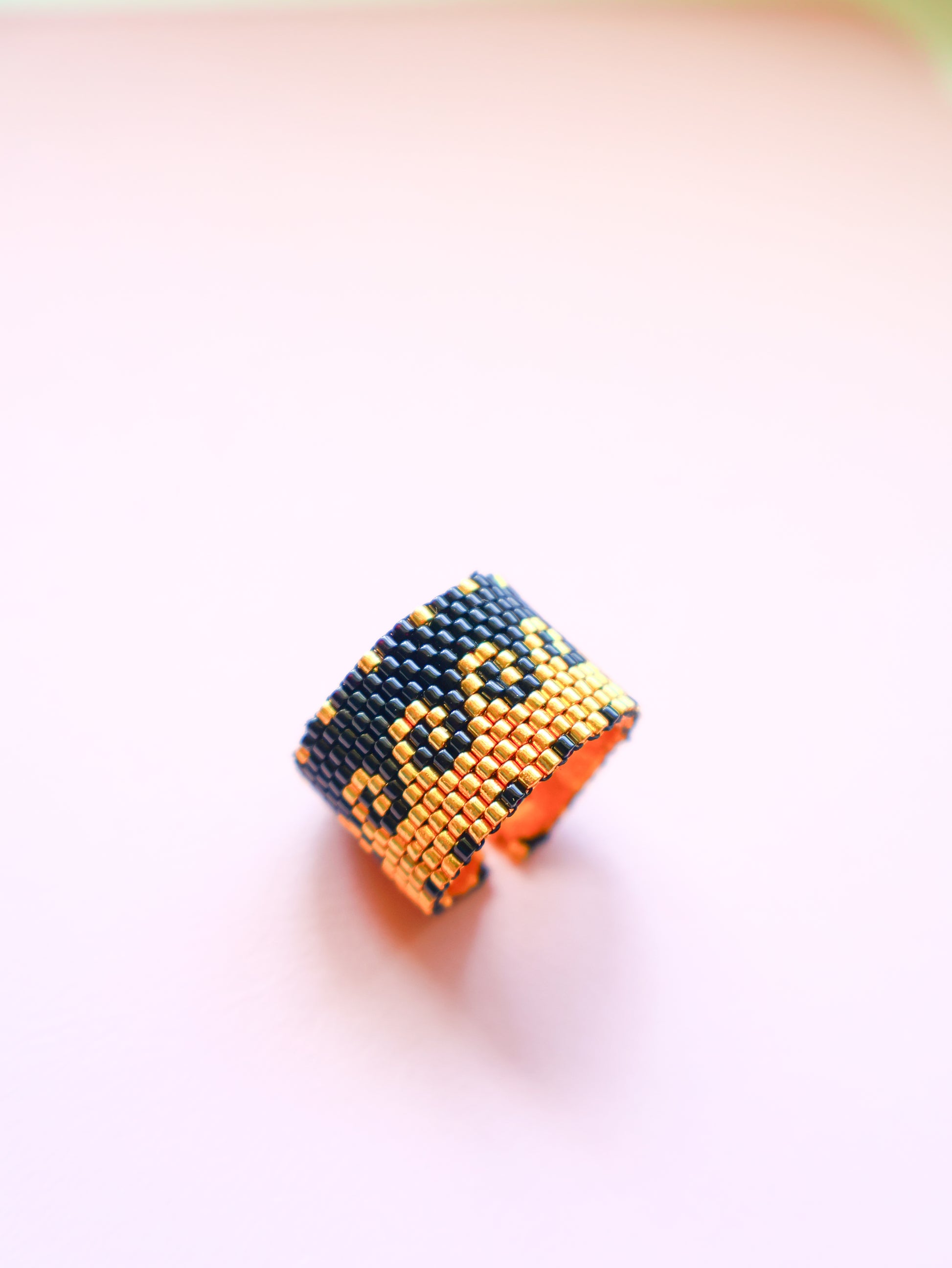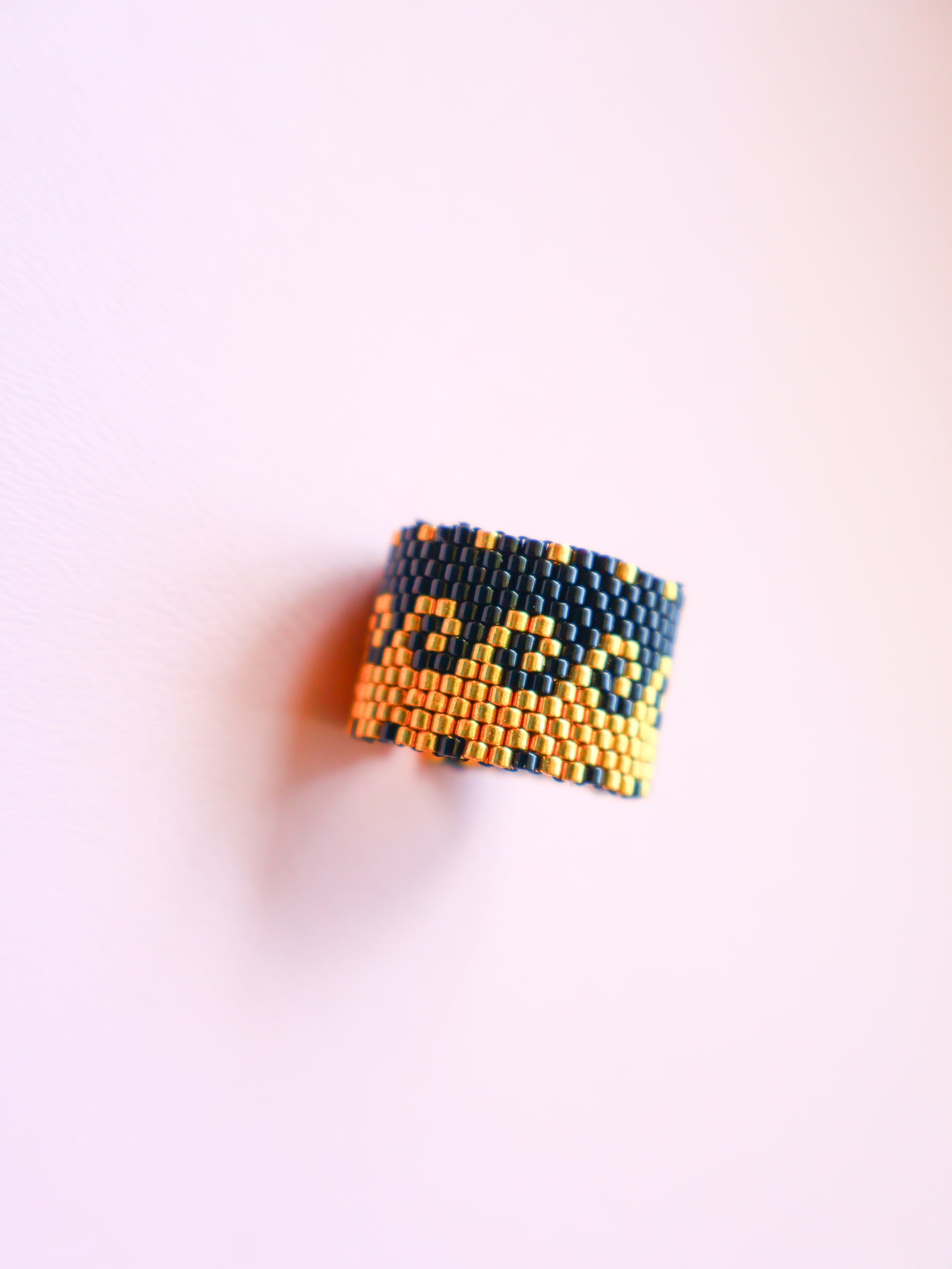 A beautifully handcrafted ring featuring delicate Japanese Miyuki beads in shimmering black and gold tones. Set on an adjustable stainless steel base, it’s waterproof, tarnish-resistant, and made to last. Handmade in Colombia by Fiammata, each piece is unique, lightweight, and full of charm.