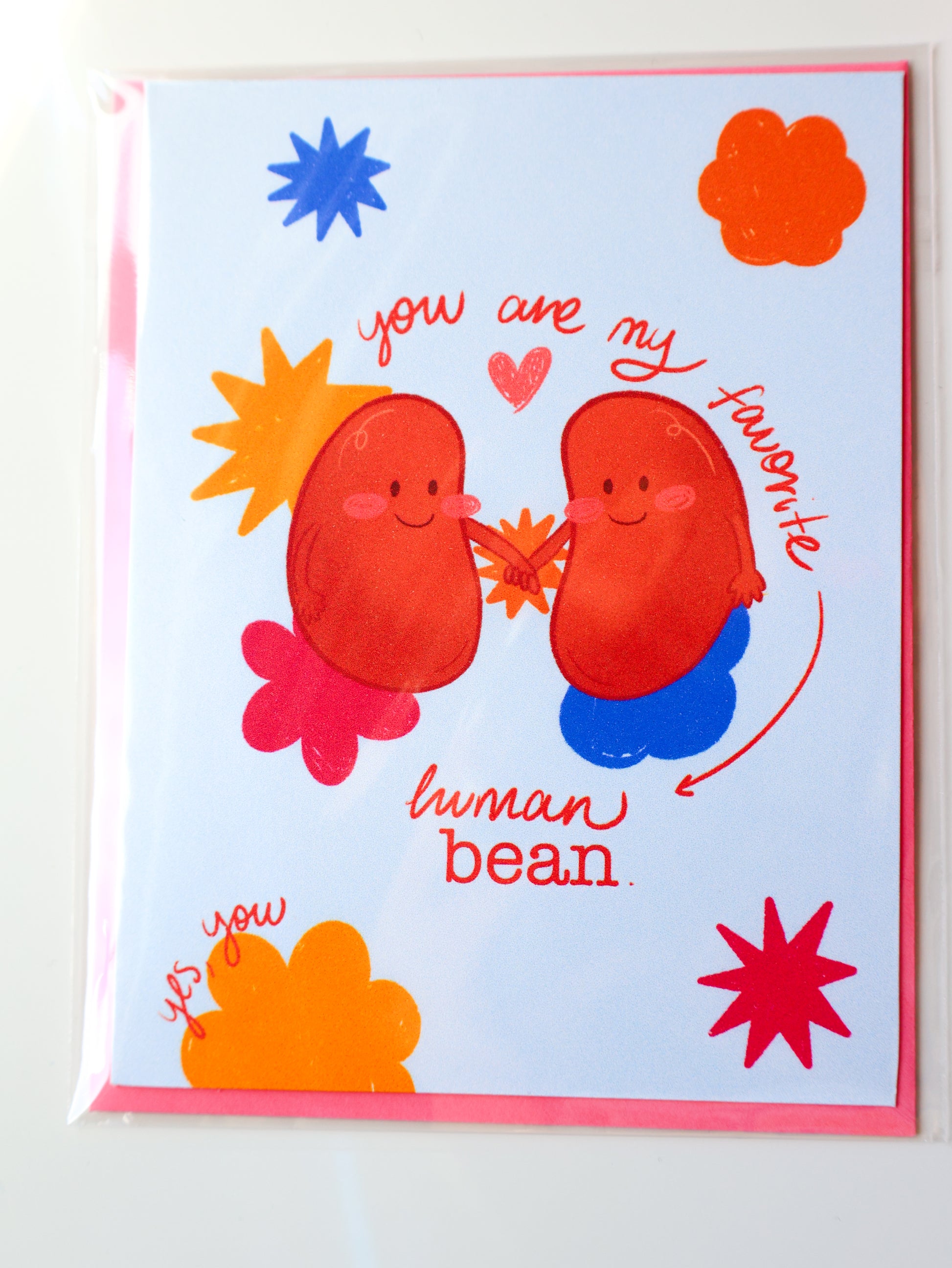 Adorably punny and full of heart, this card features two smiling beans holding hands with the message: “You are my favorite human bean.” Perfect for friends, partners, or anyone who makes life extra special.