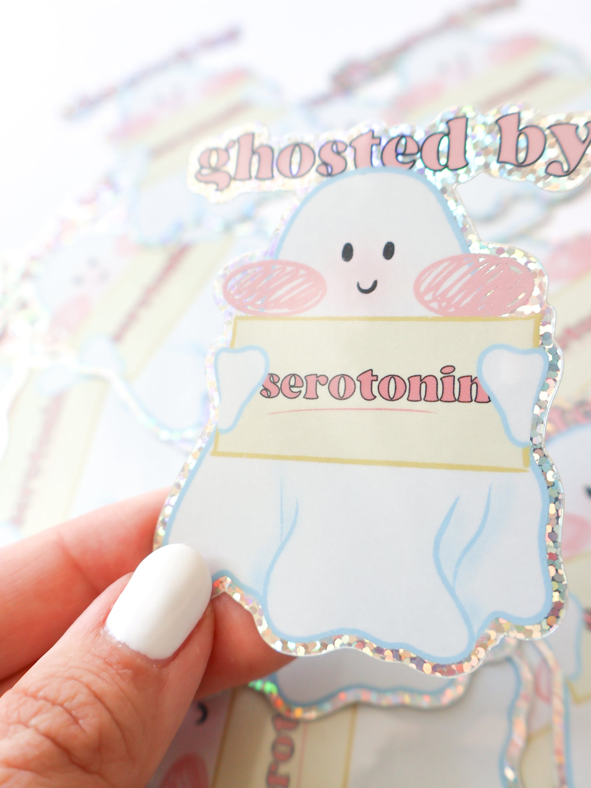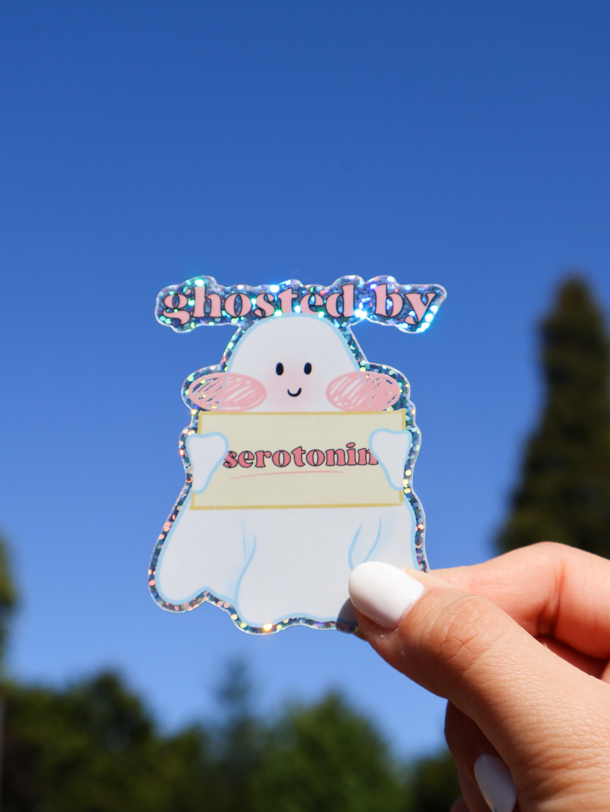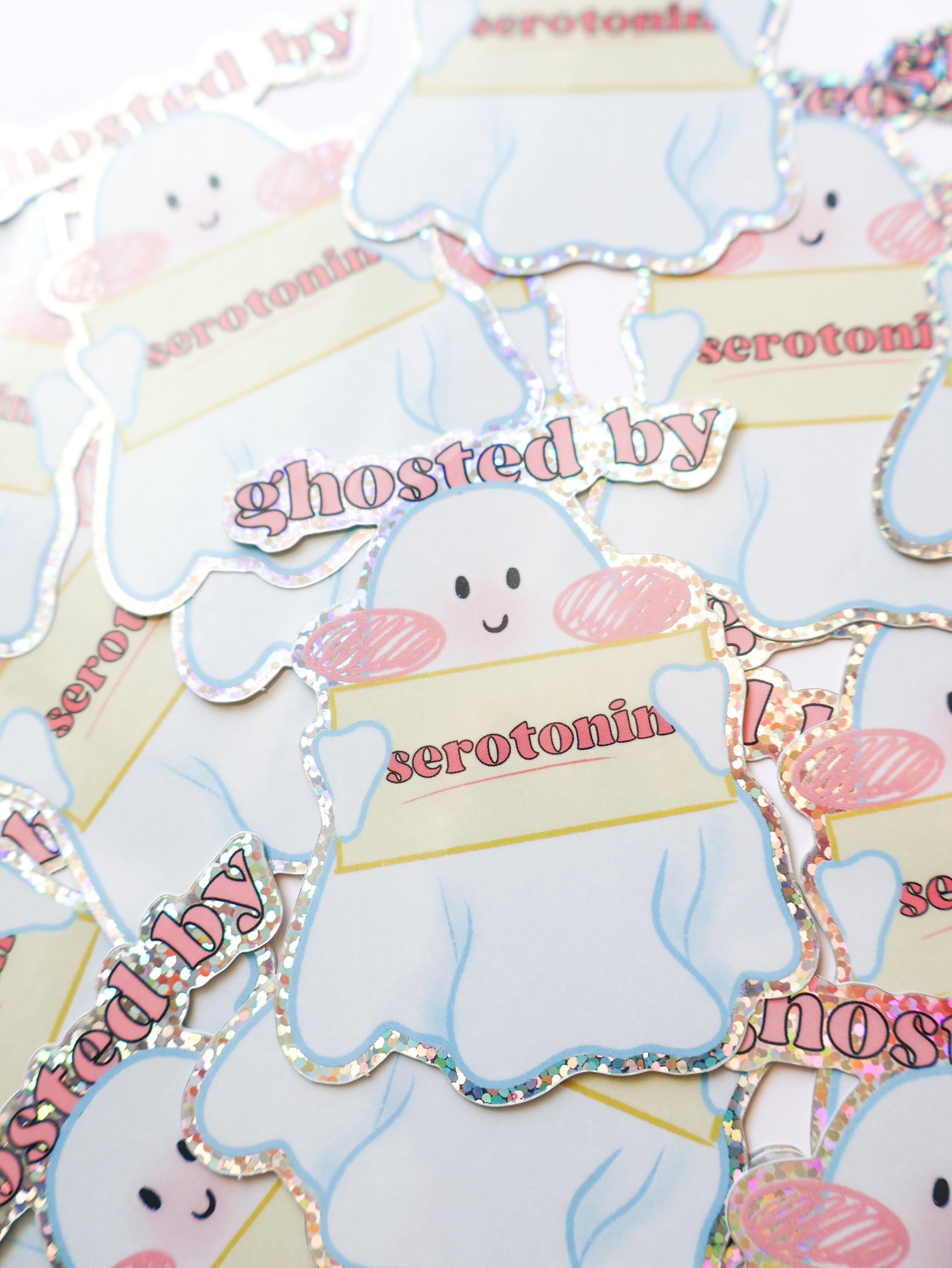Add a touch of sparkle and humor to your day with our "Ghosted by Serotonin" vinyl holographic sticker! This adorable ghost design blends cute and relatable with a shimmering holographic finish that catches the light beautifully.