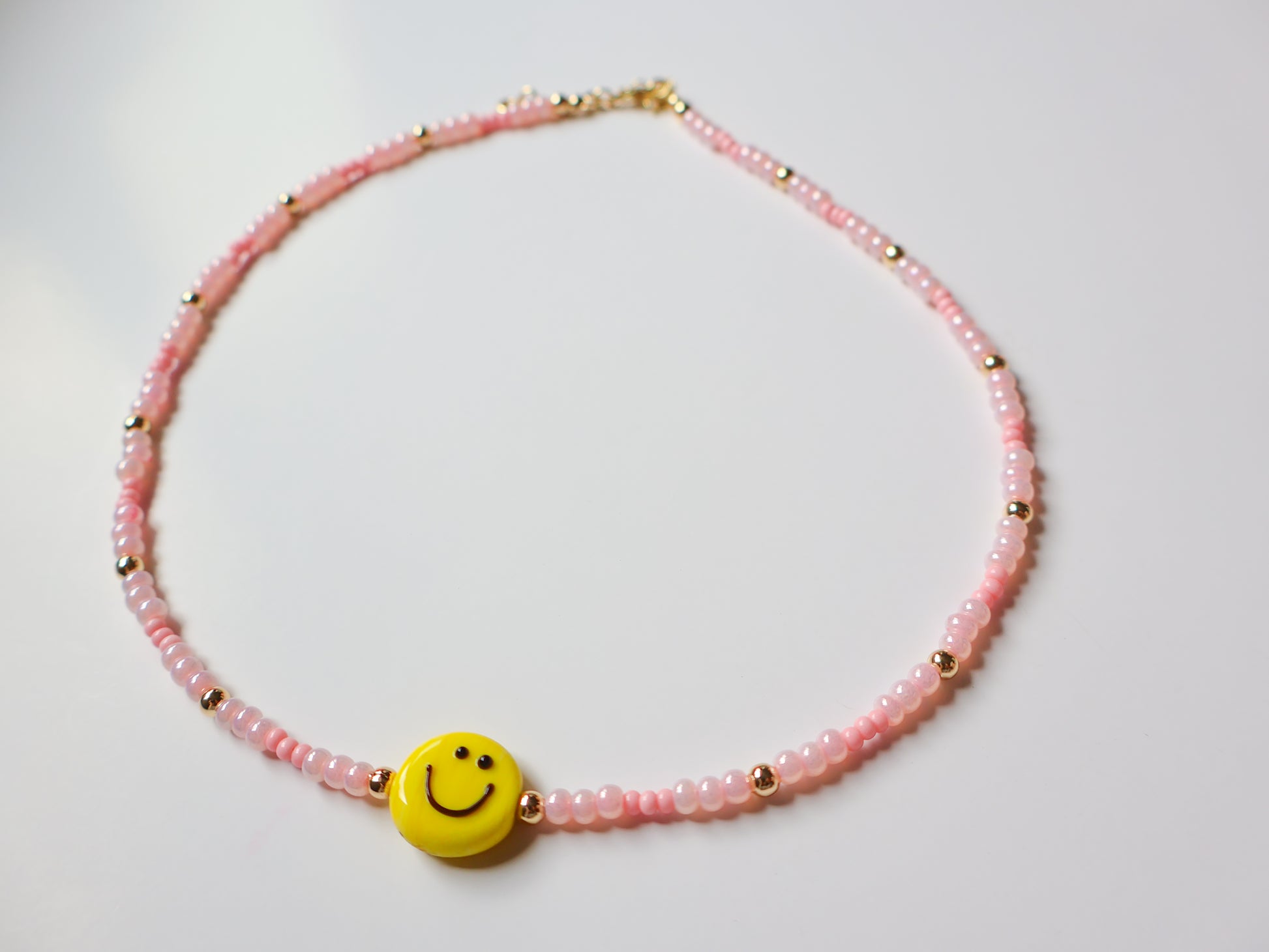 Add a pop of happiness to your style with our Happy in Pink Beaded necklace. This cute necklace features a yellow happy face made of murano glass and czech beads, making it the perfect accessory to express your playful side.