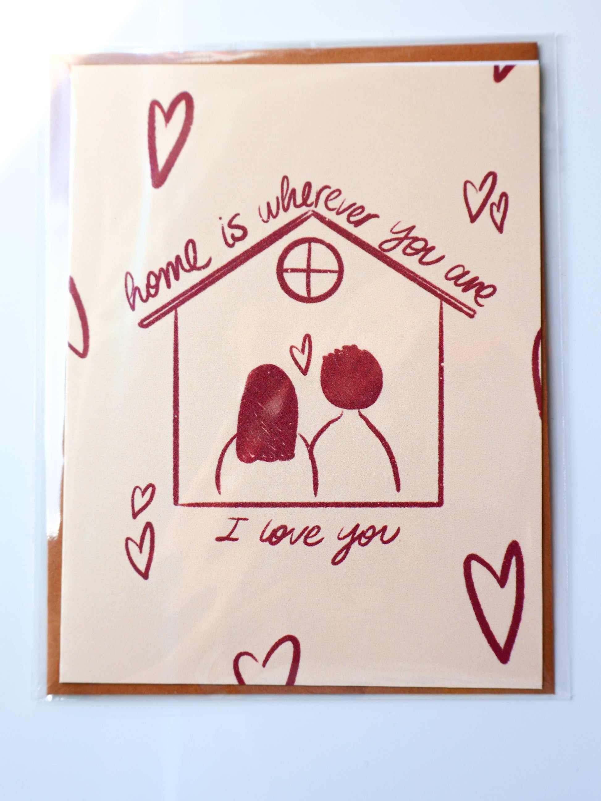 A warm and heartfelt card featuring a simple line illustration of two people inside a house, surrounded by hand-drawn hearts. The message reads: "Home is wherever you are. I love you." Perfect for anniversaries, long-distance love, or just because.