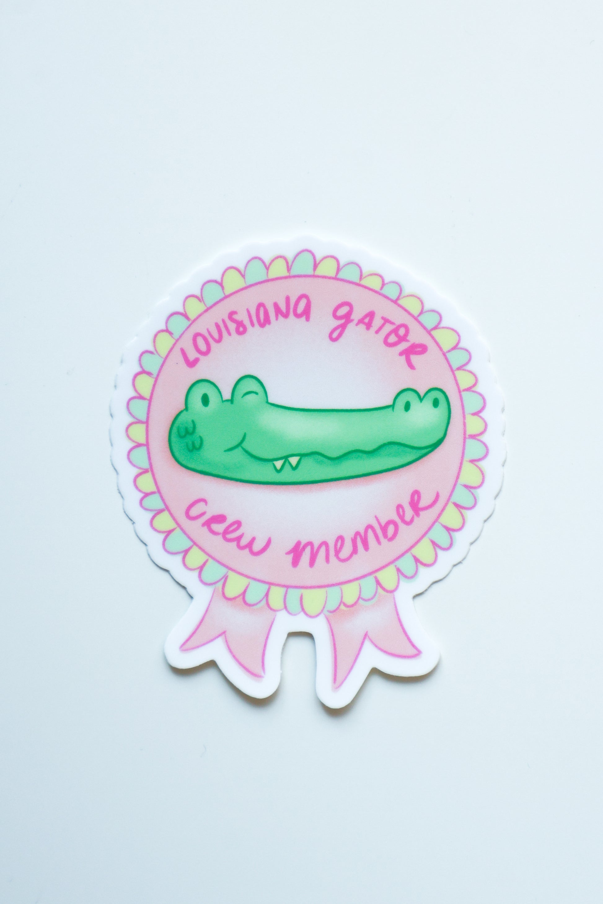 Show off your playful side with this fun Louisiana Gator Crew Member sticker! Featuring a smiling cartoon gator framed in a pink ribbon badge design, this sticker is perfect for adding a touch of charm to your laptop, water bottle, notebook, or anywhere you like.