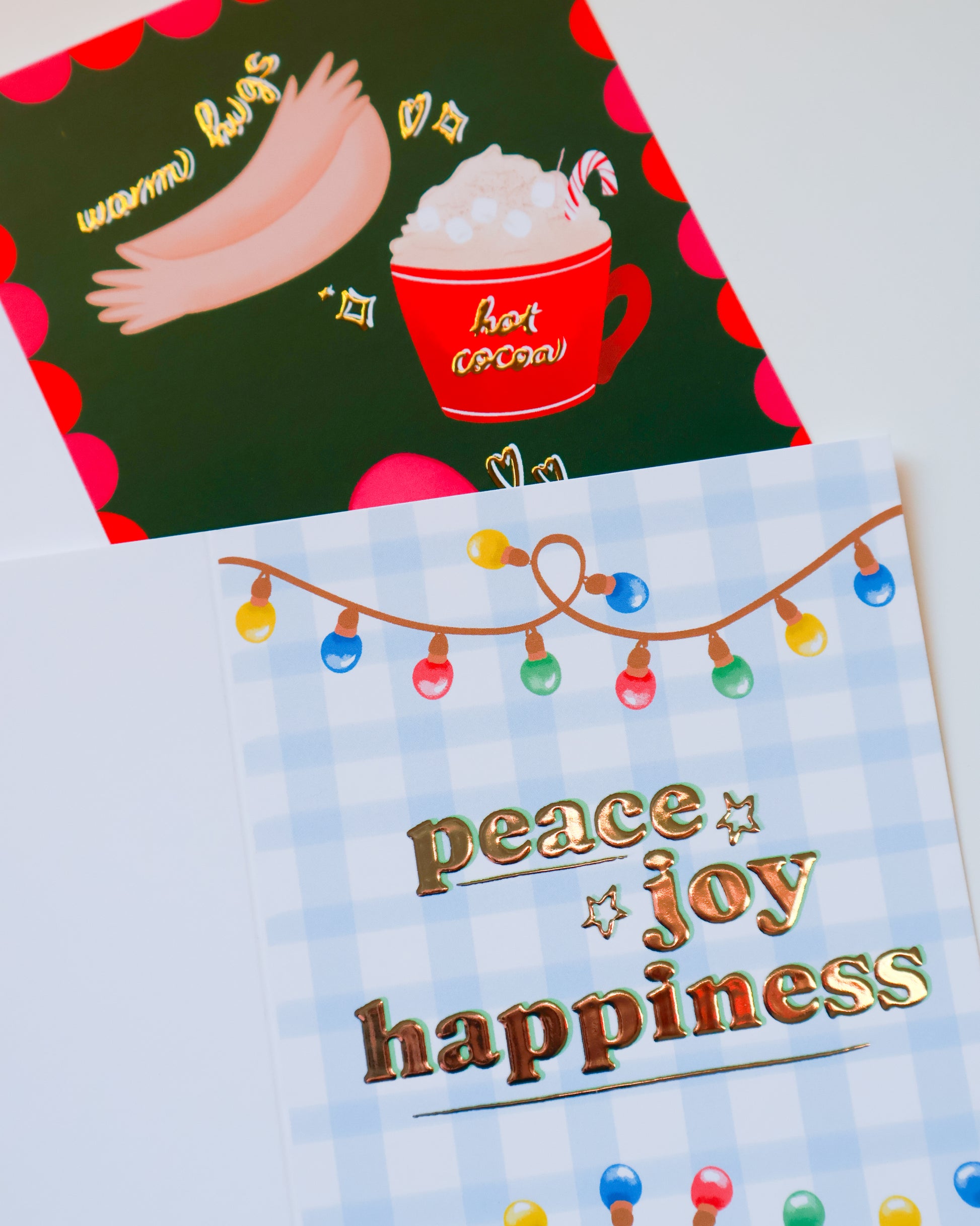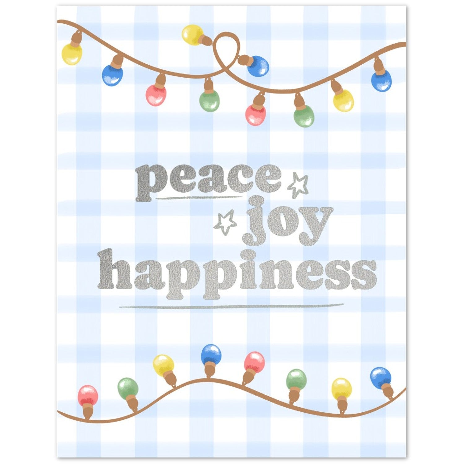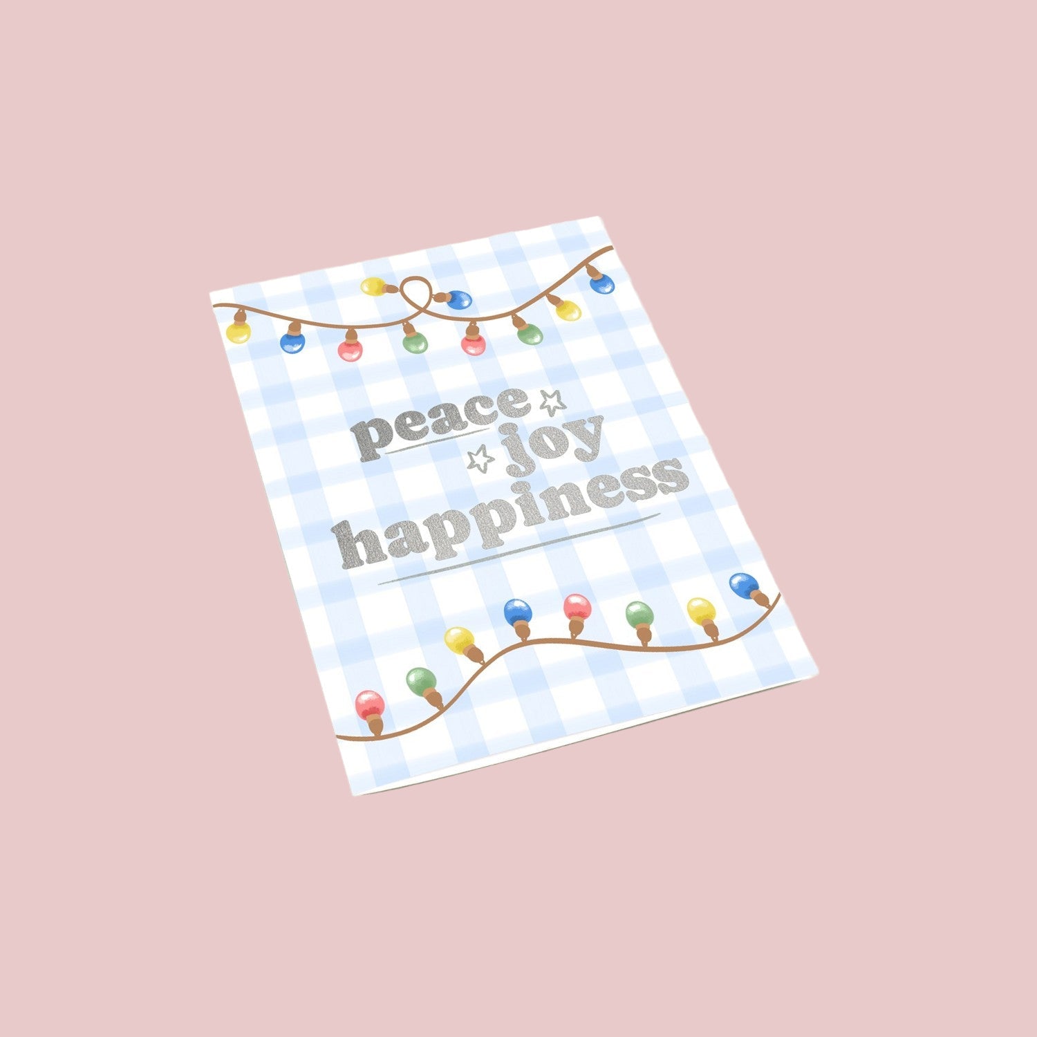 Send warm holiday cheer with this elegant card featuring “Peace, Joy and Happiness” in shimmering silver foil. A soft blue gingham pattern and twinkling holiday lights add a festive, cozy touch. Tied with a lovely ribbon, it’s perfect for friends, family, or anyone who loves a little sparkle this season.