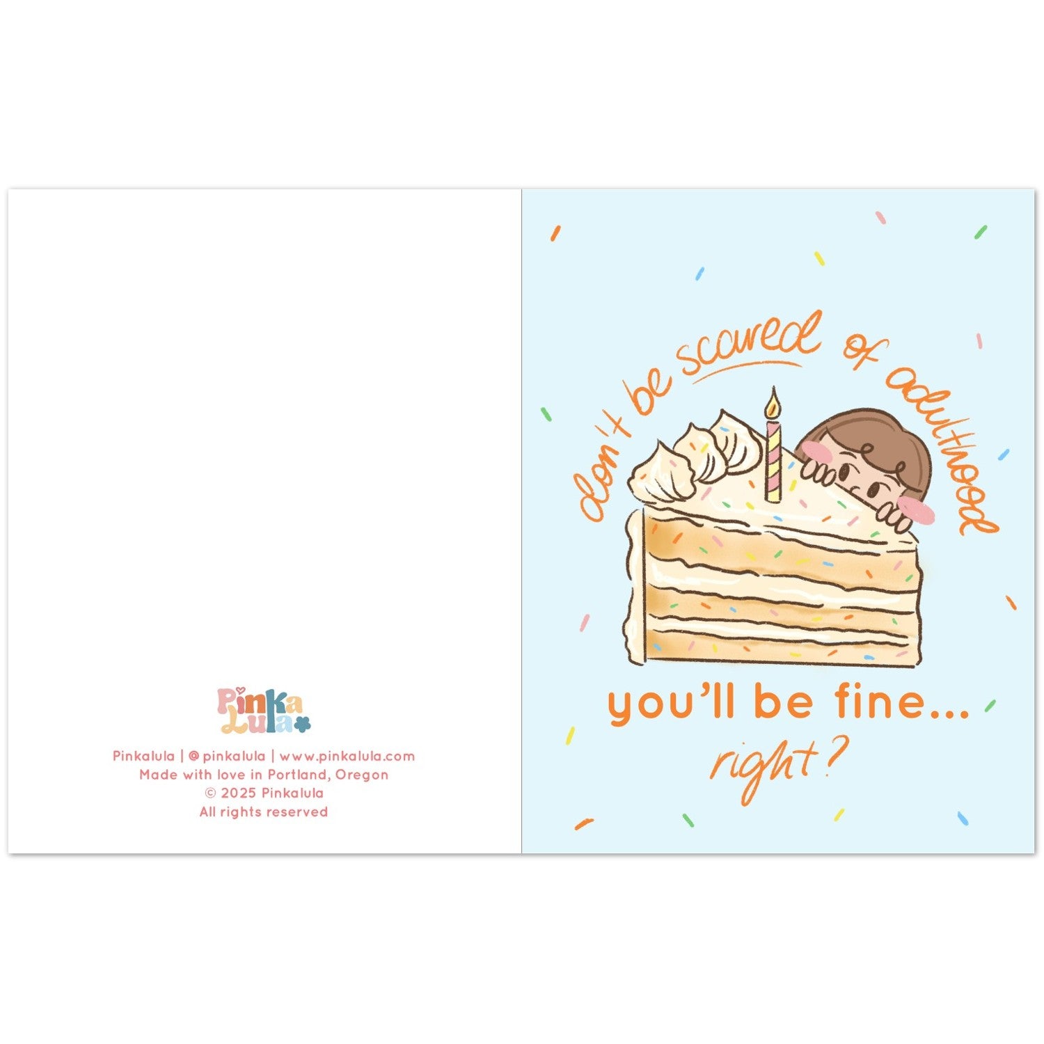 A fun and relatable card featuring a nervous character peeking over a giant slice of sprinkle-covered cake. Reads: "Don't be scared of adulthood, you'll be fine... right?" Perfect for birthdays or big life changes.