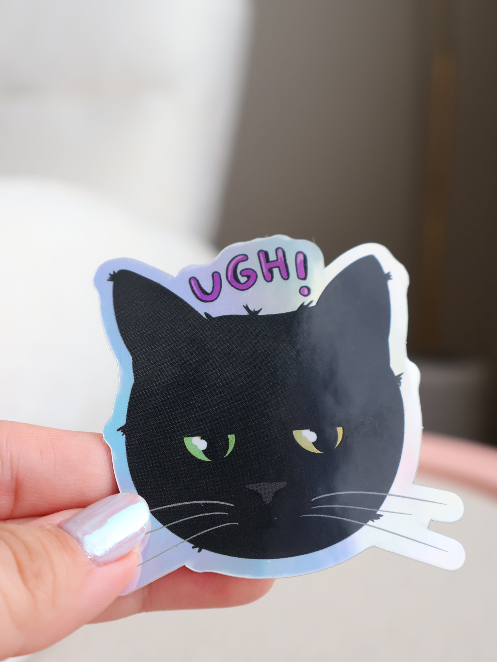 Add some purrfectly playful personality to your belongings with our Ugh! Cat Holographic Sticker. Featuring a holographic design, this sticker is sure to catch some eyes and a few laughs. (Just don't be surprised if you catch yourself saying "ugh" every time you see it!)