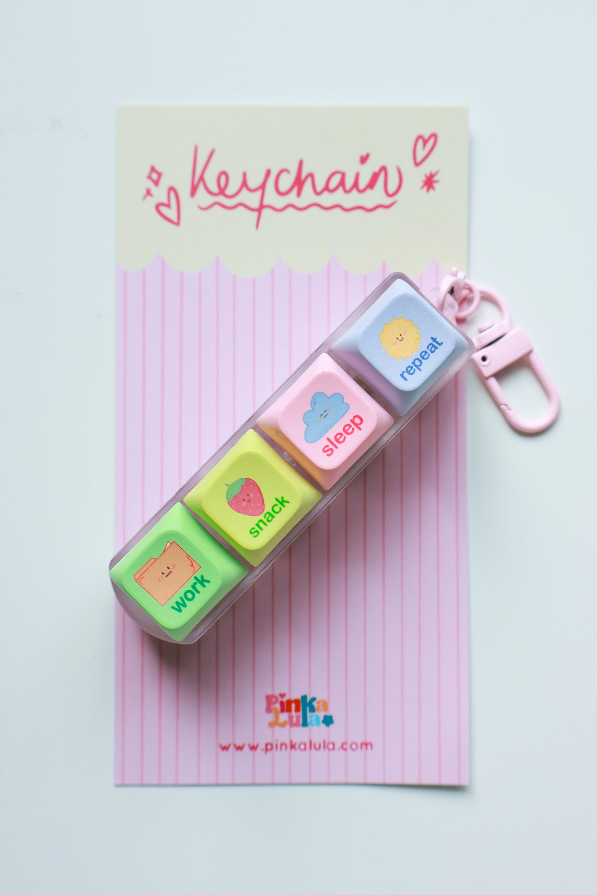 This keycap keychain features four playful keys: Work, Snack, Sleep, Repeat. Each press lights up with a clicky blue switch sound that’s as satisfying as it is fun.